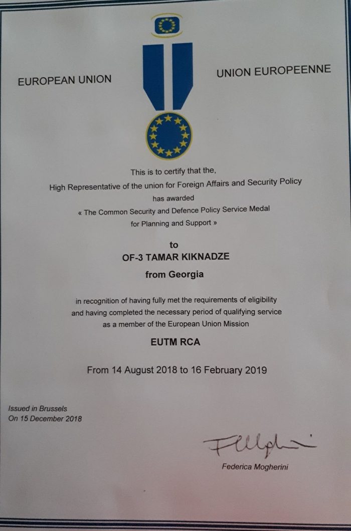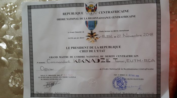 ამაყობს, რომ აფრიკის თავდაცვის მინისტრის განსაკუთრებული მედალი მიიღო… სამადლობელ წერილში ხაზგასმულია, რომ ქართულმა შეიარაღებულმა ჯარებმა მისიაში პროფესიონალიზმი გამოავლინეს, ხოლო მისი სამხედროები თავისი ქვეყნის აღმატებული ელჩები იყვნენ… მათ პორტუგალიელი ბაზის გენერლის, მაიორის ერმილიო მაიუს და ესპანელი შტაბის უფროსის დიდი მადლობები დაიმსახურეს.