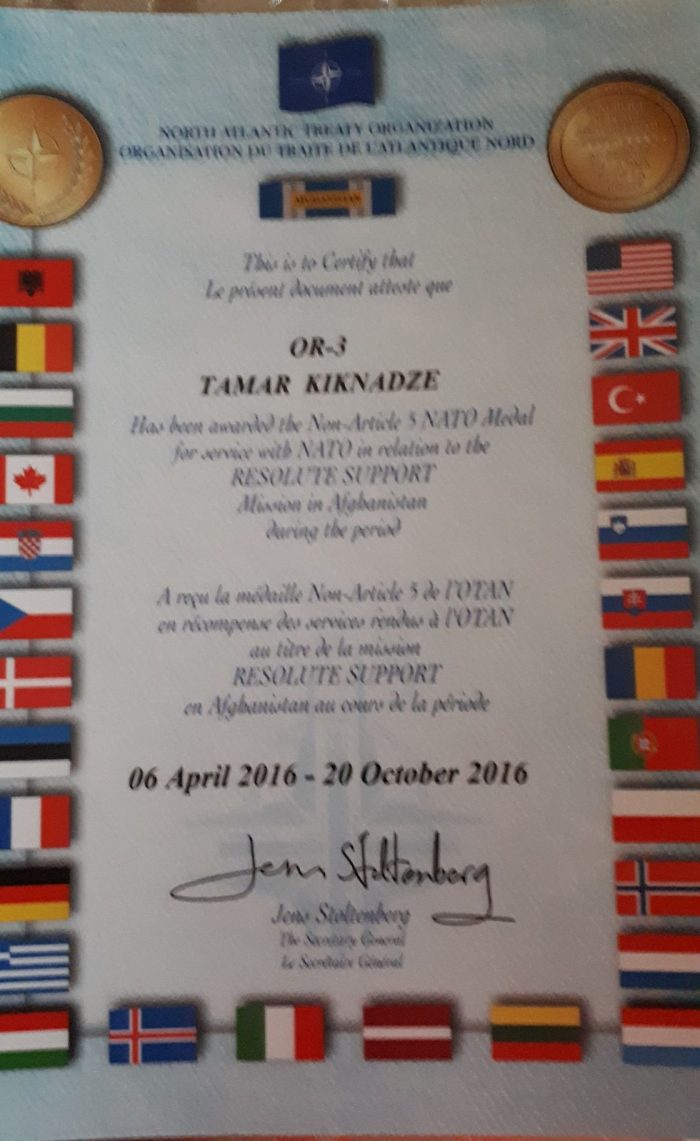 2016 წელს, ვიმყოფებოდი სამშვიდობო მისიით ქალაქ ქაბულში. არ დაგიმალავთ, გამოუცდელობის გამო ძალიან ვღელავდი, ვგრძნობდი, რამხელა პასუხისმგებლობა მეკისრებოდა. სირთულეებისა და იქ არსებული ვითარების მიუხედავად, აღნიშნულმა მისიამ წარმატებით ჩაიარა. ვხედავდი ჩვენი ქართველი ჯარისკაცების რუტინულ შრომას და თავდადებას, ქვეყნის ღირსებისა და იმიჯის ღირსეულად წარმოსაჩენად და გული სიამაყით მევსებოდა. უფრო მეტი მონდომებით ვასრულებდი დაკისრებულ მოვალეობას. ბედნიერი ვარ, რომ მისიამ წარმატებით ჩაიარა და კანონდარღვევის არანაირ ფაქტს ადგილი არ ჰქონია. ჩვენი სამხედროების მხრიდან დიდ პატივისცემას ვგრძნობდი. ძნელია, როდესაც ოჯახს წყდები და შორს ყოფნა გიხდება. ამ დროს ყველანი ვცდილობთ ერთმანეთის გამხნევებას და იმ უდიდეს პასუხისმგებლობას, რაც მისიებში ყოფნა გვაკისრებს.