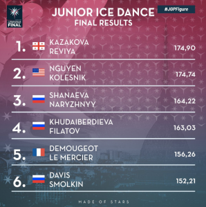 ქართველმა სპორტსმენებმა 7 დეკემბერს თავისუფალ პროგრამაში ამერიკელებს 0,12 ქულით აჯობეს. საბოლოოდ მათ 174,90 ქულა მოაგროვეს და წლის პრესტიჟული ჯილდო მოიგეს. ამ ტურნირის მეორე ადგილი ამერიკულმა, ხოლო მერამე რუსულმა წყვილმა დაიკავა.