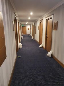 სურათებში ნახავთ დერეფანს, ყველა ოთახთან საჭმელი დევს, ერთჯერადი თეფშებით და ჭიქებით.