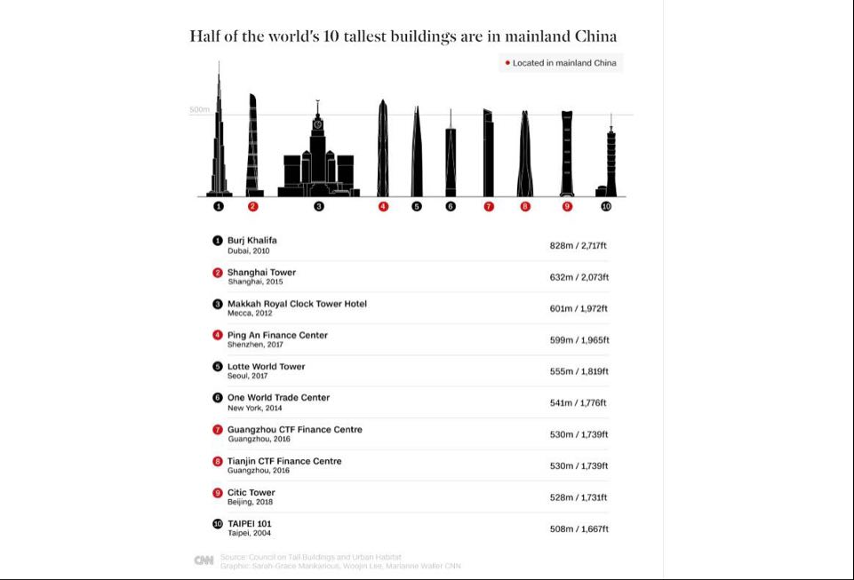 500 მეტრზე მაღალი ბოლო შენობა ჩინეთში 2018 წელს აშენდა, იგი 528 მეტრის სიმაღლისაა, ქვეყნის დედაქალაქში მდებარეობს და მსოფლიო ცათამბჯენების რეიტინგში მე-9 ადგილს იკავებს. თუმცა, როგორც ჩანს, ქვეყანას აღარ სურს “ბეტონის რბოლაში” მონაწილეობის მიღება, მით უფრო, რომ დისტანცია პირველ ადგილამდე – “დაეწიოს და გაუსწროს ბურჯ ხალიფას” – ზუსტად 196 მეტრია.
