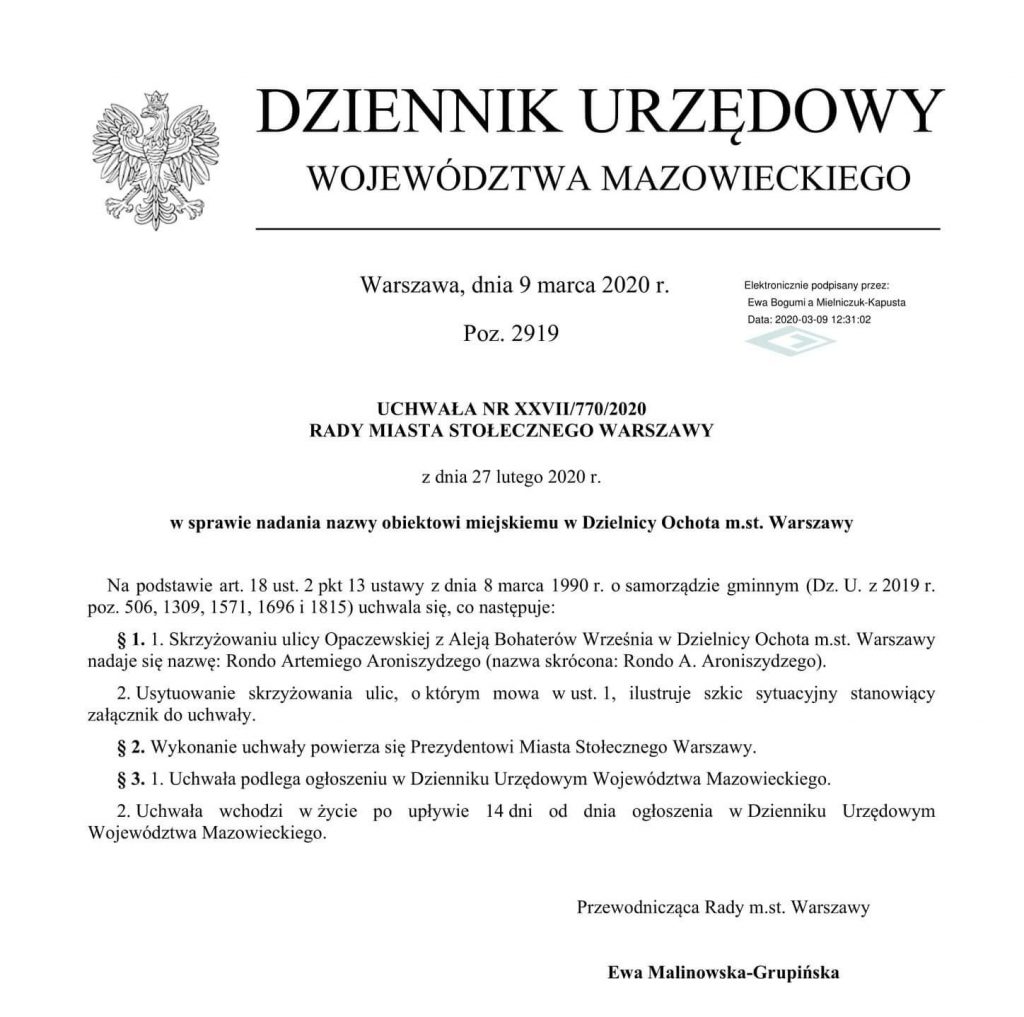 პოლონეთის არმიის, ქართველი ოფიცრის, მაიორ არტემ არონიშიძის სახელი ვარშავის ერთ-ერთ მოედანს მიენიჭა.
