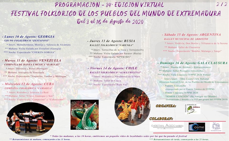მსოფლიოს ხალხთა 34-ე ფოლკლორული ფესტივალში, რომელიც ესპანეთში ეწყობა, საქართველოც მონაწილეობს. ღონისძიება ექსტრემადურას ფოლკლორის ფედერაციის ეგიდით და ესპანეთის ქალაქ ალიკანტეში ქართული ასოციაცია „საქართველოს რესპუბლიკა და ემიგრანტების” თაოსნობით იმართება. ფესტივალი პანდემიის გამო, ონლაინ რეჟიმში მიმდინარეობს.