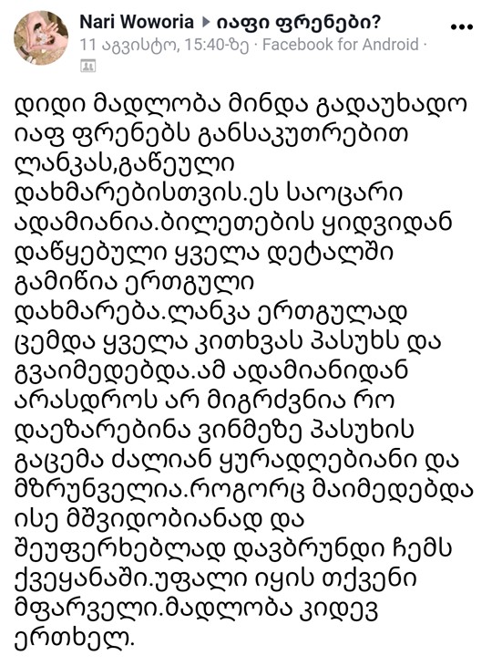 მოკლედ რომ გითხრათ, ისინი უცხო ქვეყანაში ჩასულ ქართველებს არა მხოლოდ ავია ბილეთებს სთავაზობენ, ადგილზე ჩასულებს ბოლომდე, სასტუმროში დაბინავებამდე, რომ იტყვიან, პატრონობენ. ყოფილა შემთხვევა, რომ გარკვეული გარემოებების გამო, ქუჩაში დარჩენილი უიმედო ქართველისთვის გაუწევიათ დახმარება…