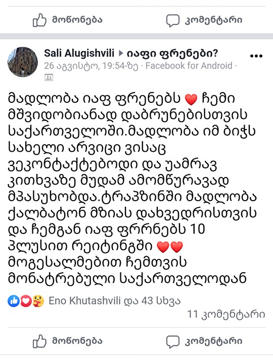 ენო:როცა საქმის კეთება დავიწყეთ ამას მთელი მონდომებით და პასუხისმგებლობით ვაკეთებდით. ეს საქმიანობა ორმა დავიწყეთ, მოგვიანებით მეგობრები შემოგვიერთდნენ და დღეს უკვე ხუთნი ვართ. მომხმარებელთან ხაზზე ვართ მანამდე, სანამ ის დანიშნულების ადგილამდე არ ჩავა. ძალიან ბედნიერები ვართ, რადგან მოგვეცა საშუალება, რომ ბევრ ადამიანს დავეხმაროთ. როცა მსოფლიოს საზღვრები პანდემიის გამო ჩაიკეტა, მე და ლანკამ შევძელით რამდენიმე ასეული ადამიანის სახლში დაბრუნება და ამან უფრო დიდი მოტივაცია მოგვცა.