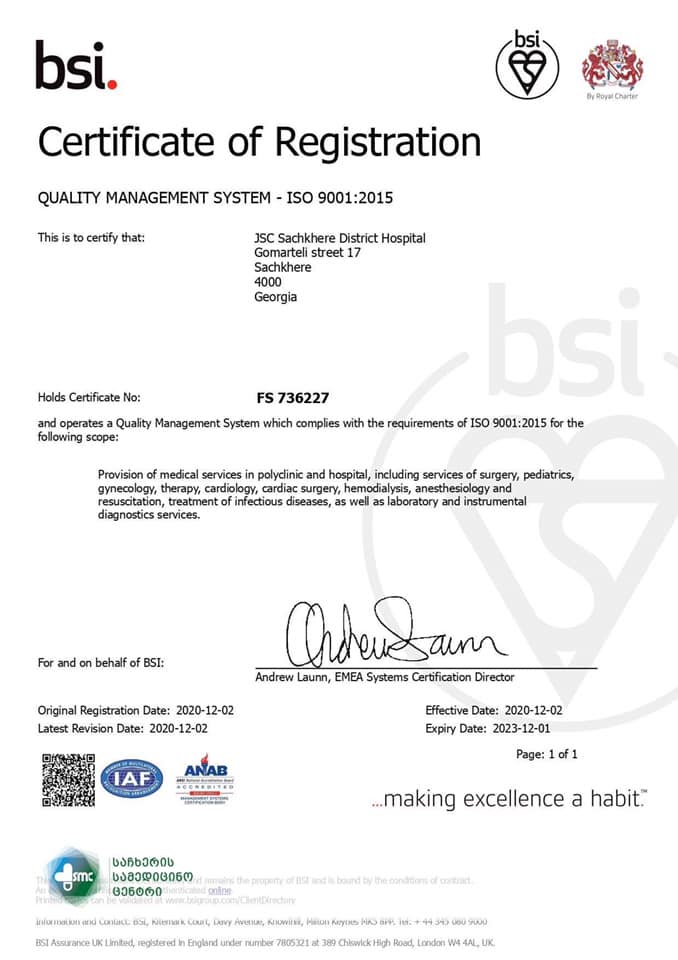 BSI-ს საერთაშორისო ჯგუფის გადაწყვეტილებით საჩხერის სამედიცინო ცენტრი ISO 9001:2015 სერთიფიკატის მფლობელი პირველი კლინიკა გახდა საქართველოში.⠀