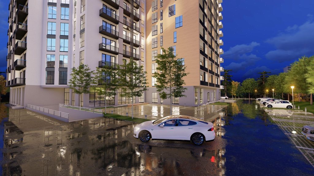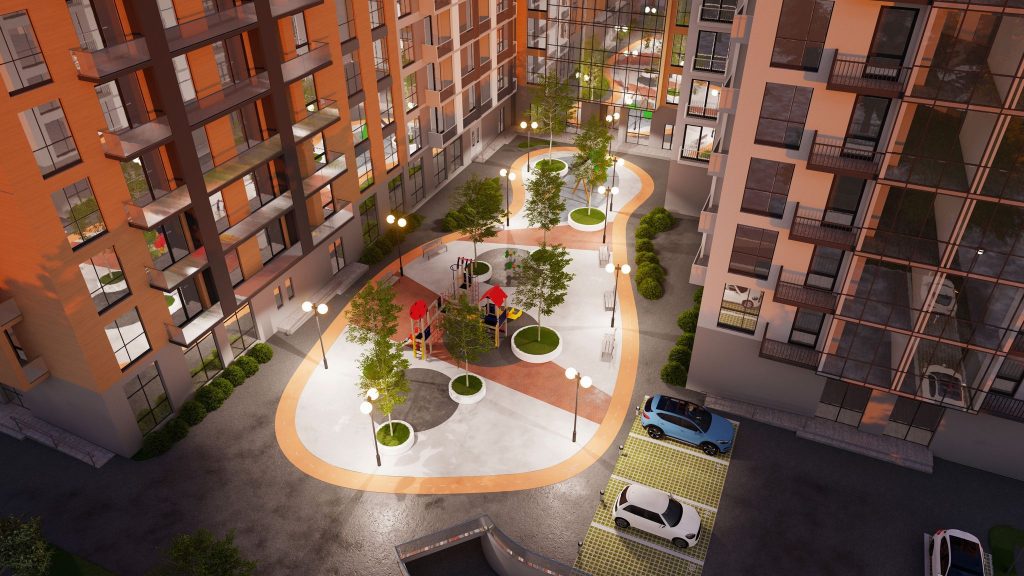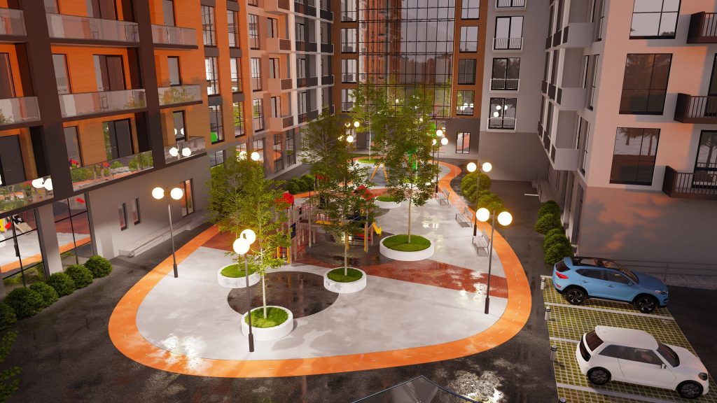 რაც შეეხება განსხვავებას, ეს, პირველ რიგში, ტერიტორიის ფართობია. მიწის ნაკვეთი 6 660 კვ.მ-ს შეადგენს, რაც საშუალებას გვაძლევს, დავაპროექტოთ შიდა საუბნო ველოგზები ისე, რომ ადამიანებმა ველოსიპედებით სეირნობა ტერიტორიიდან გაუსვლელად შეძლონ. კომპლექსის ცენტრში განთავსებული იქნება დიდი საზოგადოებრივი სივრცე, ბავშვთა სათამაშო მოედნები და ღია სავარჯიშო დარბაზი, რომელთაც წრეს დაარტყამს ველობილიკი.