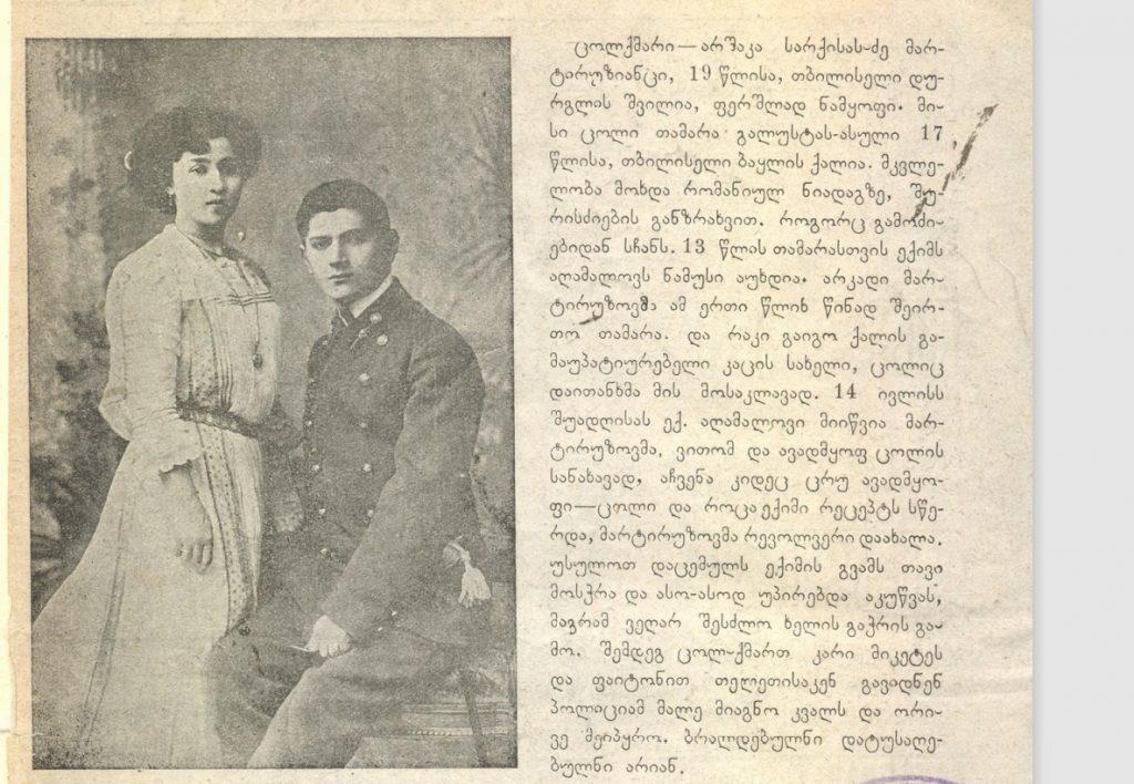 “ცოლ-ქმარი არშაკა სარქისას ძე მარტირუზიანცი, 19 წლისა, თბილისელი დურგლის შვილია, ფერშლად ნამყოფი. მისი ცოლი თამარა გალუსტას ასული 17 წლისა, თბილისელი ბაყლის ქალია.