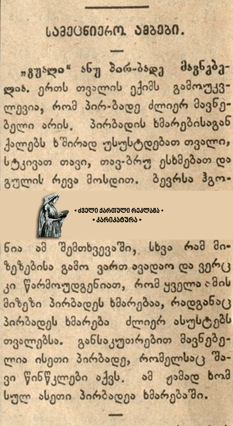 “ვუალი ანუ პირ-ბადე მავნებელია. ერთს თვალის ექიმს გამოუკვლევია, რომ პირ-ბადე ძლიერ მავნებელია. პირბადის ხმარებისაგან ქალებს ხშირად უსუსტდებათ თვალი, სტკივათ თავი, თავ-ბრუ ესხმებათ და გულის რევა მოსდით. ბევრსა ჰგონია ამ შემთხვევაში, სხვა რამ მიზეზებისა გამო ვართ ავადაო და ვერც კი წარმოუდგენიათ, რომ ყველა ამის მიზეზი პირბადის ხმარებაა, რადგანაც პირბადის ხმარება ძლიერ ასუსტებს თვალებსა. განსაკუთრებით მავნებელია ისეთი პირბადე, რომელსაც შავი წინწკლები აქვს. ამ ჟამად ხომ სულ ასეთი პირბადეა ხმარებაში“ – სამეცნიერო ამბები, 1897 წელი