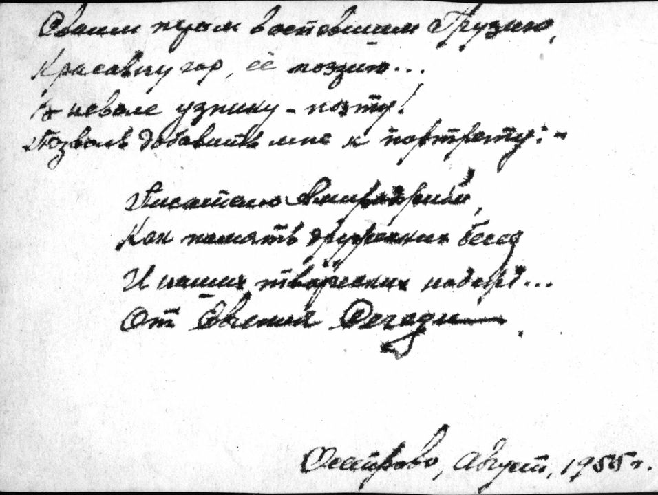 ეს ფოტო ოსერტოვოშია გადაღებული 1955 წლის აგვისტოში. მეორე მხარეს ევგენი პეტროვიჩის გაკრული ხელით ეს სიტყვები აწერია: