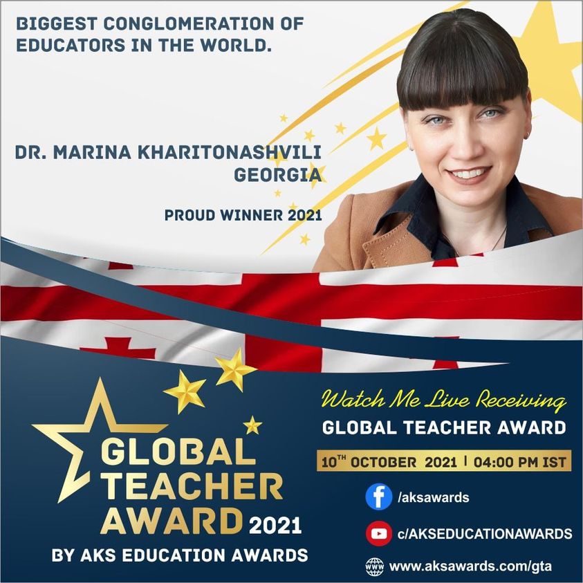 „2021წლის 15 ივნისს გავხდი საქართველოს მასწავლებლის ეროვნული ჯილდოს ათეულის წევრი. 2021 წლის 7 სექტემბერს გავხდი გლობალური მასწავლებლის ჯილდოს გამარჯვებული საქართველოდან. ვამაყობ რომ გავხდი მსოფლიოს აღიარებული  და დაფასებული მასწავლებელი.“ – წერს მარი ხარიტონაშვილი თავის ფეისბუქ გვერდზე.