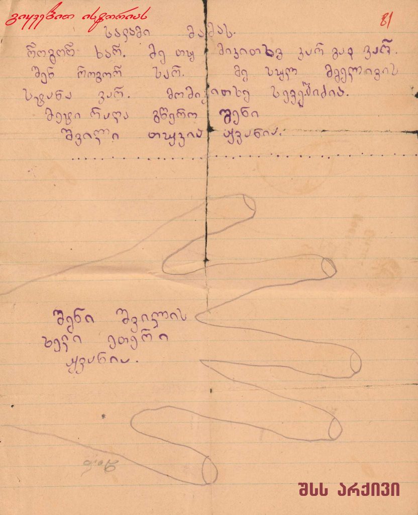 „როგორ ხარ. მე თუ მიკითხავ კარგად ვარ. შენ როგორ ხარ. მე სულ მგელივისტანა ვარ. მომიკითხე სევე ბიძია. მეტი რაღა გწერო. შენი შვილი თუკია ჟვანია“. (წერილის სტილი დაცულია)