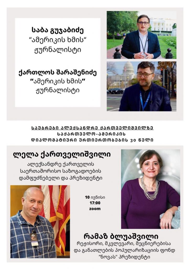 10 ივნისს, 17 საათზე, ქუთაისის ამერიკული კუთხე წარმოგიდგენთ ონლაინ საჯარო ლექციას “საუბრები ალექსანდრე ქართველზე”.