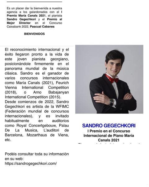 შეგახსენებთ, რომ სანდრო გეგეჭკორი ბარსელონაში, „მარია კანალსის პიანისტთა საერთაშორისო კონკურსის“ გამარჯვებულია. მან საფინალო ტურში პეტრე ჩაიკოვსკის პირველი საფორტეპიანო კონცერტი შეასრულა და პირველი პრემია და მსმენელის სპეციალური პრიზი დაიმსახურა, რომლის მფლობელიც ონლაინ ხმის მიცემის შედეგად გამოვლინდა. სანდროს პირველ პრემიასთან ერთად ფულადი ჯილდოც (25000 €) გადაეცა.
