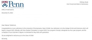 „დღეს დილით პენსილვანიის უნივერსიტეტიდან მომივიდა ჩარიცხვის წერილი, რაც ცხოვრების ახალი ეტაპის დასაწყისია. რთულია სიტყვებით გადმოვცე ის სიხარული, რასაც ახლა განვიცდი, თუმცა ვიცი, რომ ამ ყველაფერს ვერ შევძლებდი, რომ არა უამრავი ადამიანის დახმარება და გვერდში დგომა მთელი ამ პერიოდის განმავლობაში😊