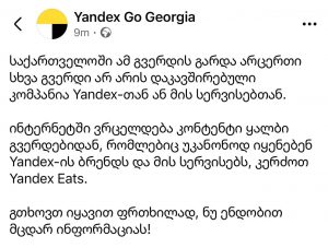– საქართველოში მოქმედი Yandex Go-ს სერვისის „ფეისბუკის“ გვერდზე დევს კომპანიის განცხადება, რომ გვერდი და სურათი არის ყალბი და არანაირი კავშირი არ აქვს კომპანიასთან;