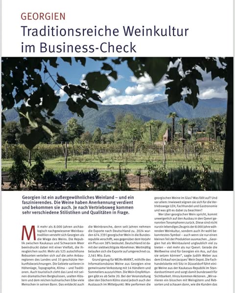 „Wein+Markt“ წარმოადგენს ერთ-ერთ წამყვან სპეციალიზებულ გამოცემას გერმანიის ღვინის კომერციული სექტორისთვის, რომელიც სამიზნე აუდიტორიას ბაზრის სიახლეებსა და თანამედროვე მოთხოვნებს სთავაზობს. აღნიშნულ გამოცემაში საუკეთესო ქართული ღვინოების და წარმოების ტრადიციების წარმოჩენა, ხელს შეუწყობს გერმანიის ბაზარზე მათ პოპულარიზაციასა და გაყიდვების ზრდას.