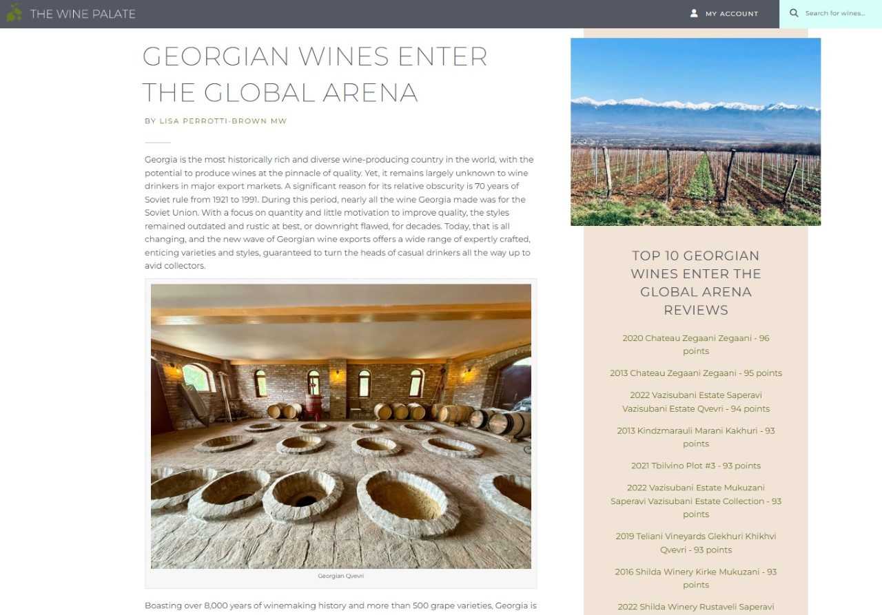 (საქართველოზე სტატიისა და ქართული ღვინის შეფასებების სანახავად აუცილებელია საიტზე რეგისტრაცია: https://thewinepalate.com/.).