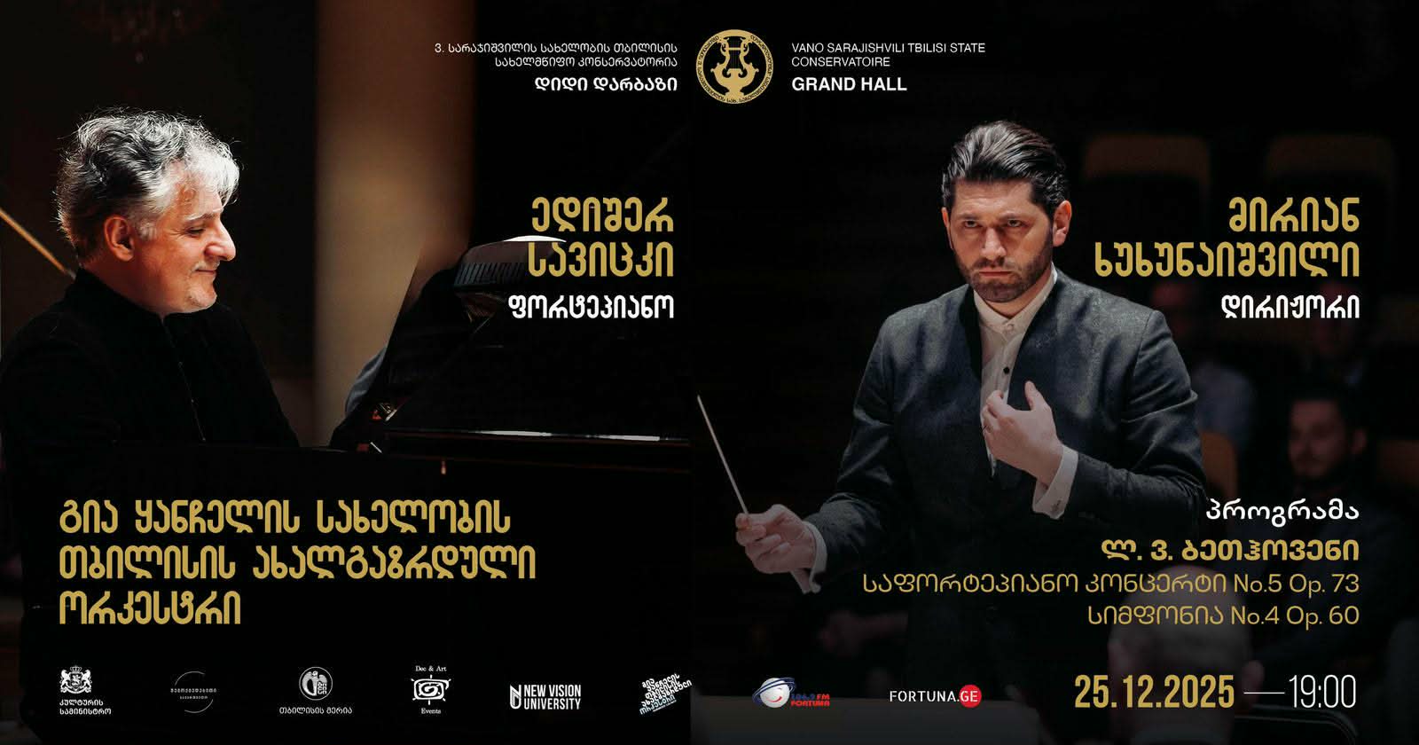 25 დეკემბერს, 19:00 საათზე, კონსერვატორიის დიდ დარბაზში კომპანია „დეკარტი“ წარმოგიდგენთ: უცხოეთში მოღვაწე ქართველი პიანისტის – ალაბამას უნივერსიტეტის პროფესორის და თორაძის საერთაშორისო მუსიკალური ფესტივალის სამხატვრო ხელმძღვანელის, Yamaha-ის პირველი ქართველი არტისტის – ედიშერ სავიცკისა და ეროვნული სასახლის „გია ყანჩელის სახელობის თბილისის ახალგაზრდული ორკესტრის“ კონცერტს, მირიან ხუხუნაიშვილის დირიჟორობით.