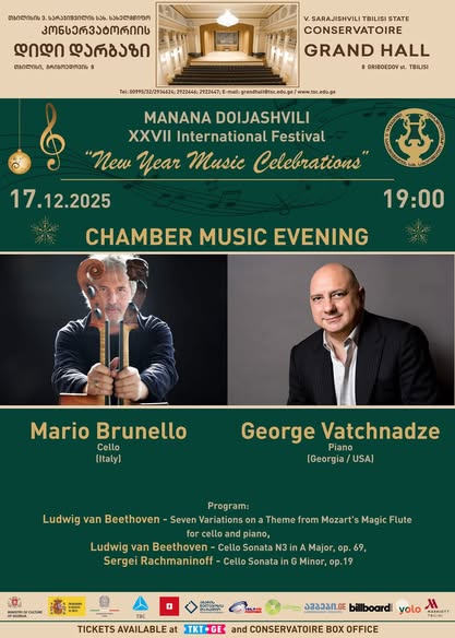 თბილისის სახელმწიფო კონსერვატორიის ინფორმაციით, მანანა დოიჯაშვილის სახელობის XXVII საერთაშორისო ფესტივალის “საახალწლო მუსიკალური შეხვედრები” შემდეგი კონცერტი გაიმართება დღეს, 17 დეკემბერს, 19:00 საათზე – კამერული მუსიკის საღამო, მარიო ბრუნელო, ჩელო / იტალია; გიორგი ვაჩნაძე, ფორტეპიანო / საქართველო / აშშ.